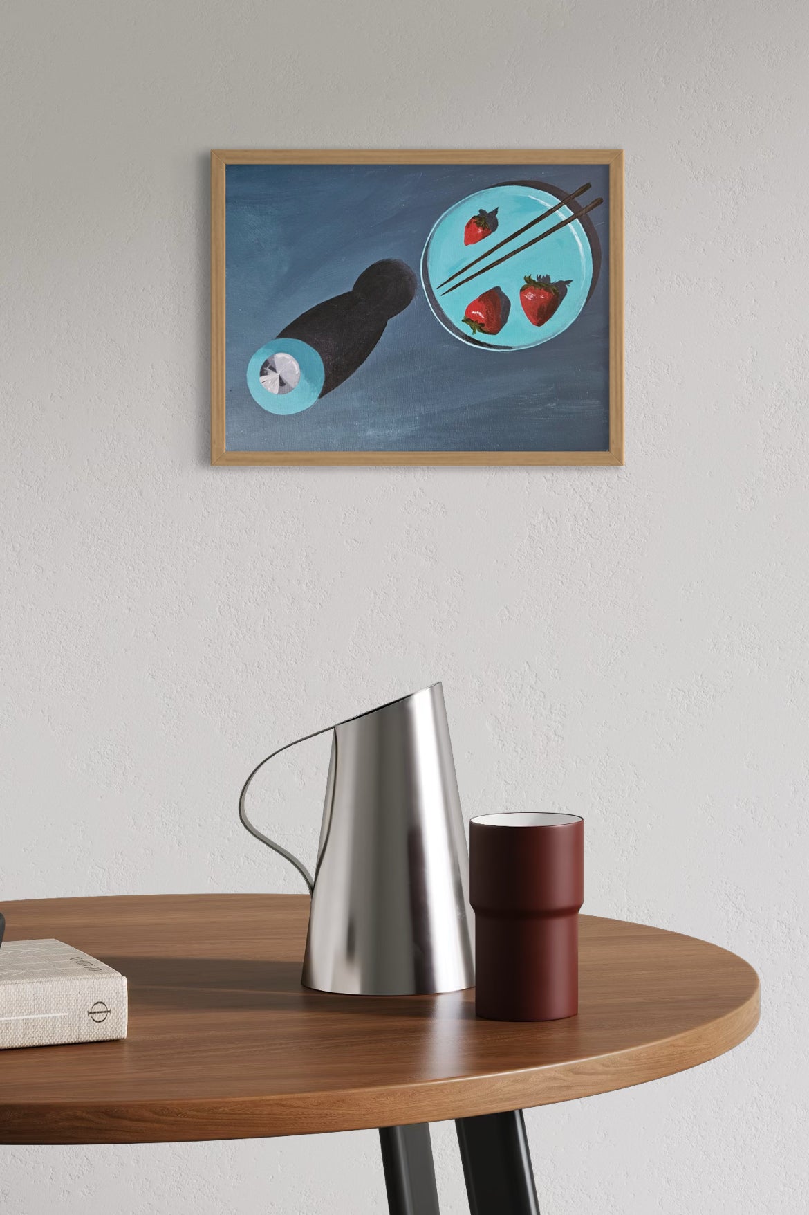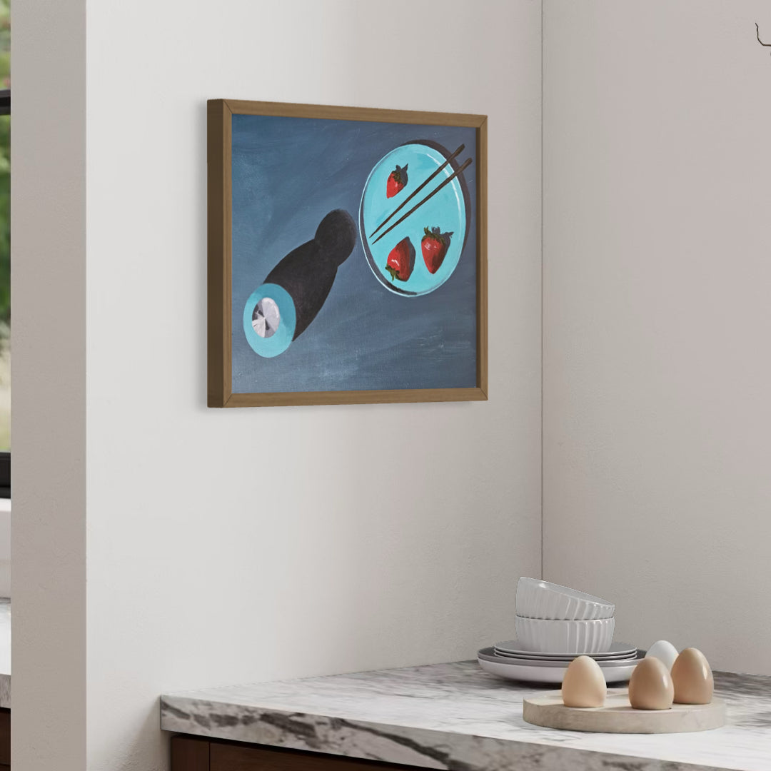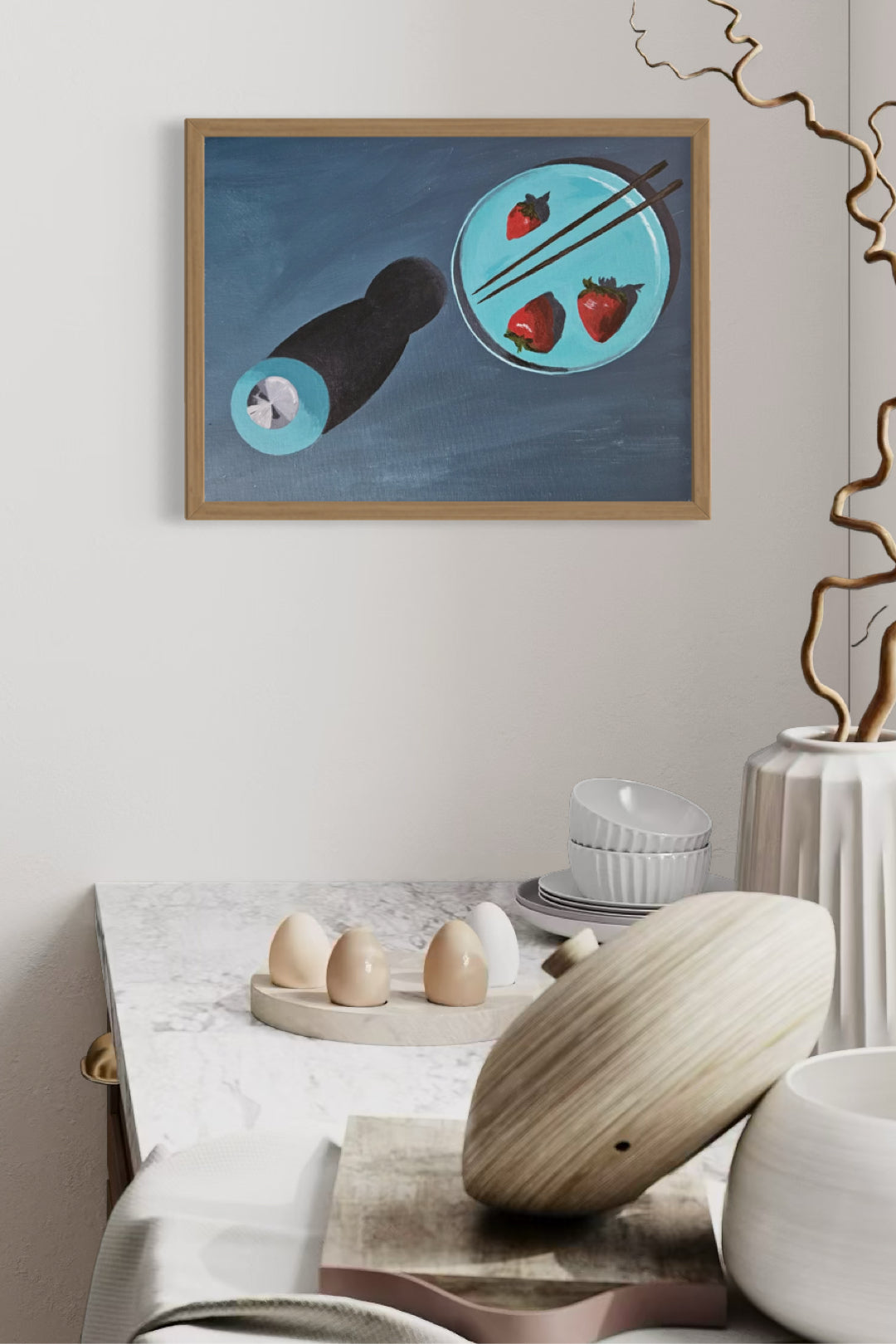 Acrylic painting on canvas board, framed in a minimalist natural frame.