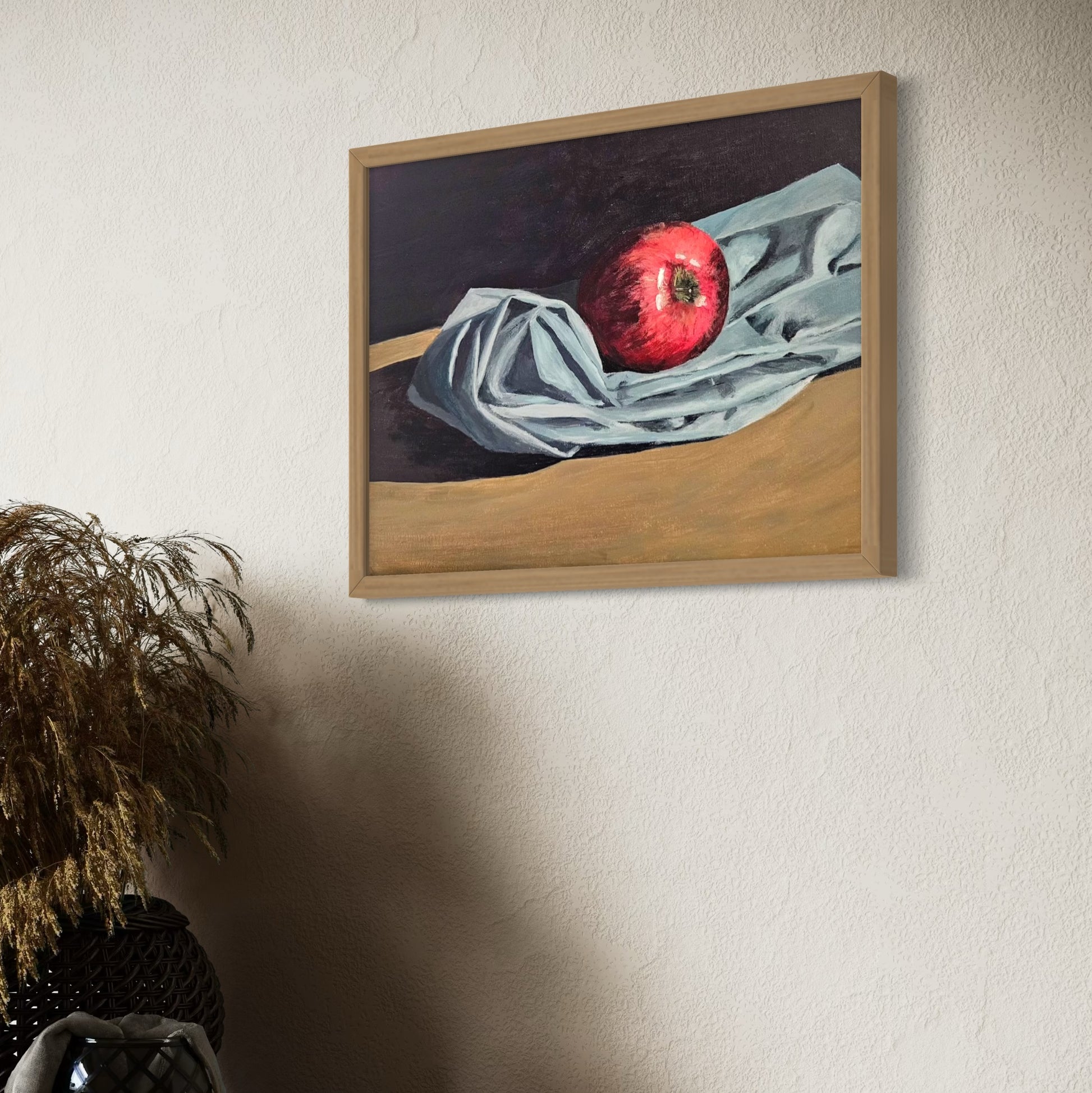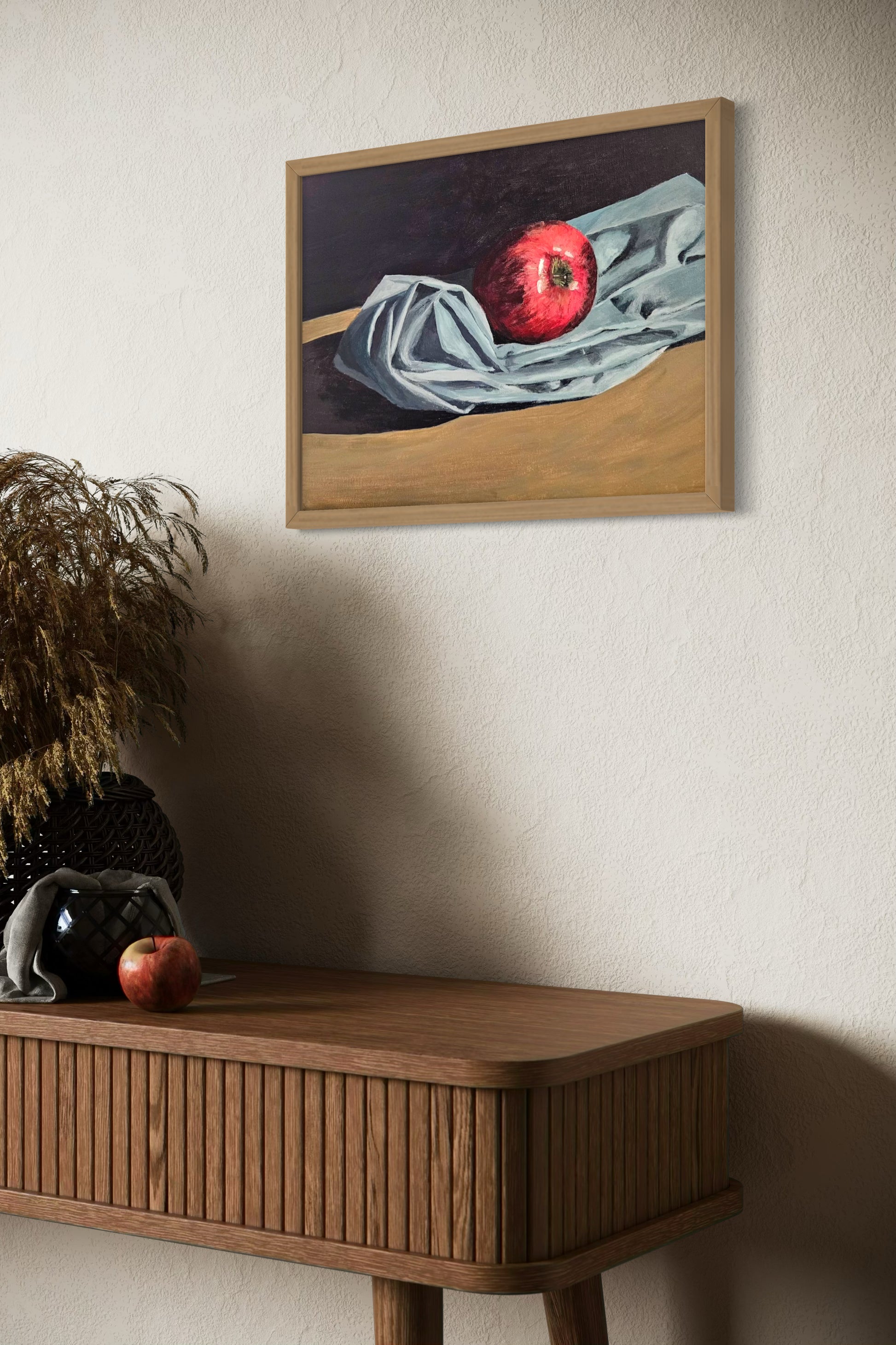 Original still life painting by Renata with dynamic composition of an apple on beautiful draped napkin.