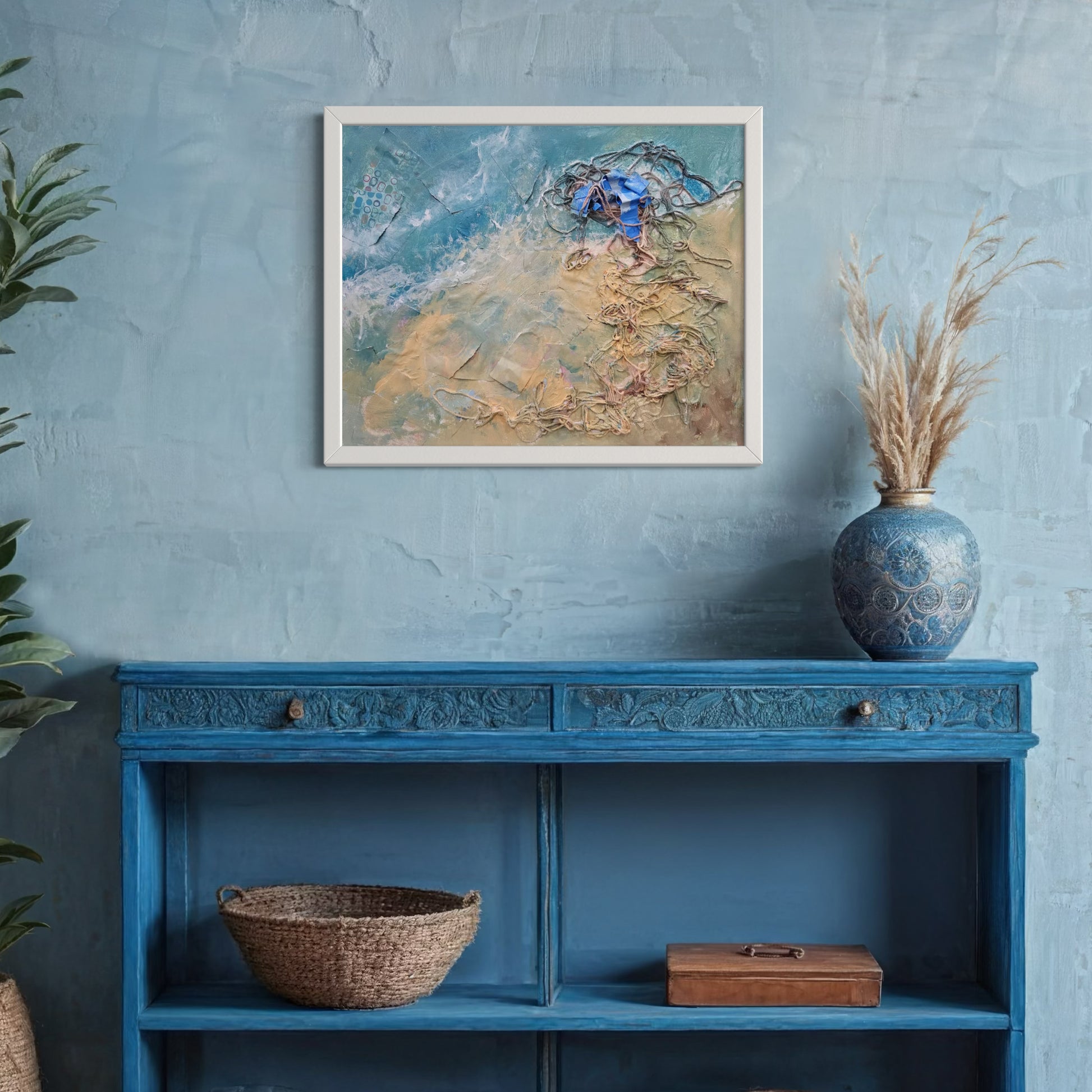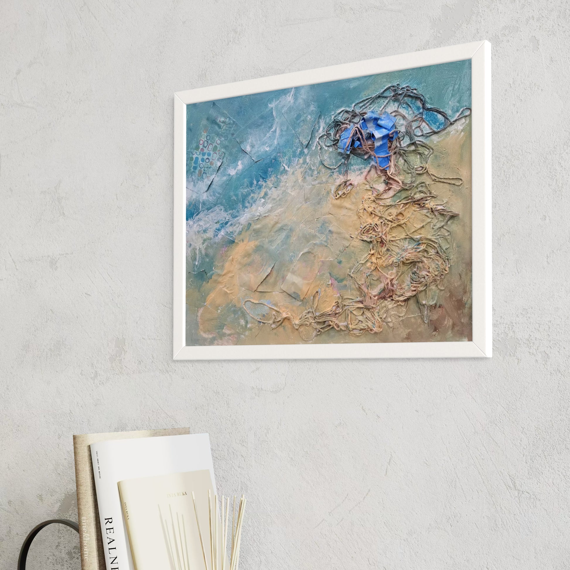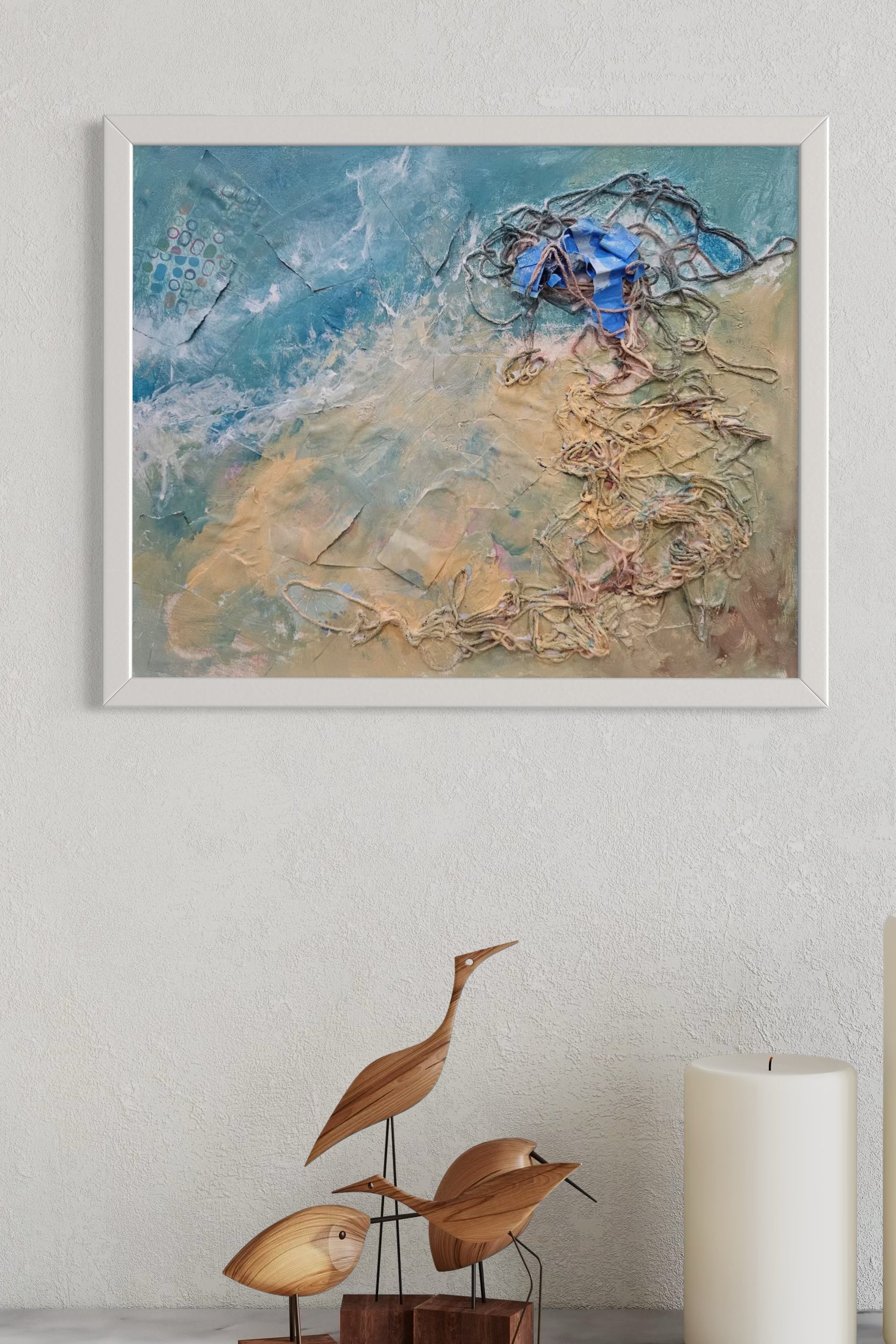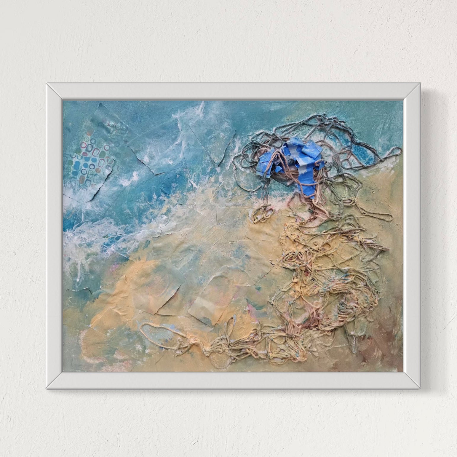 "Beach" is a fun original mixed-media painting by Renata, inspired by her recent travel to the Carrebean. She incorporated various "atypical" materials in the paintings including some yarns, paper collage, and tape.