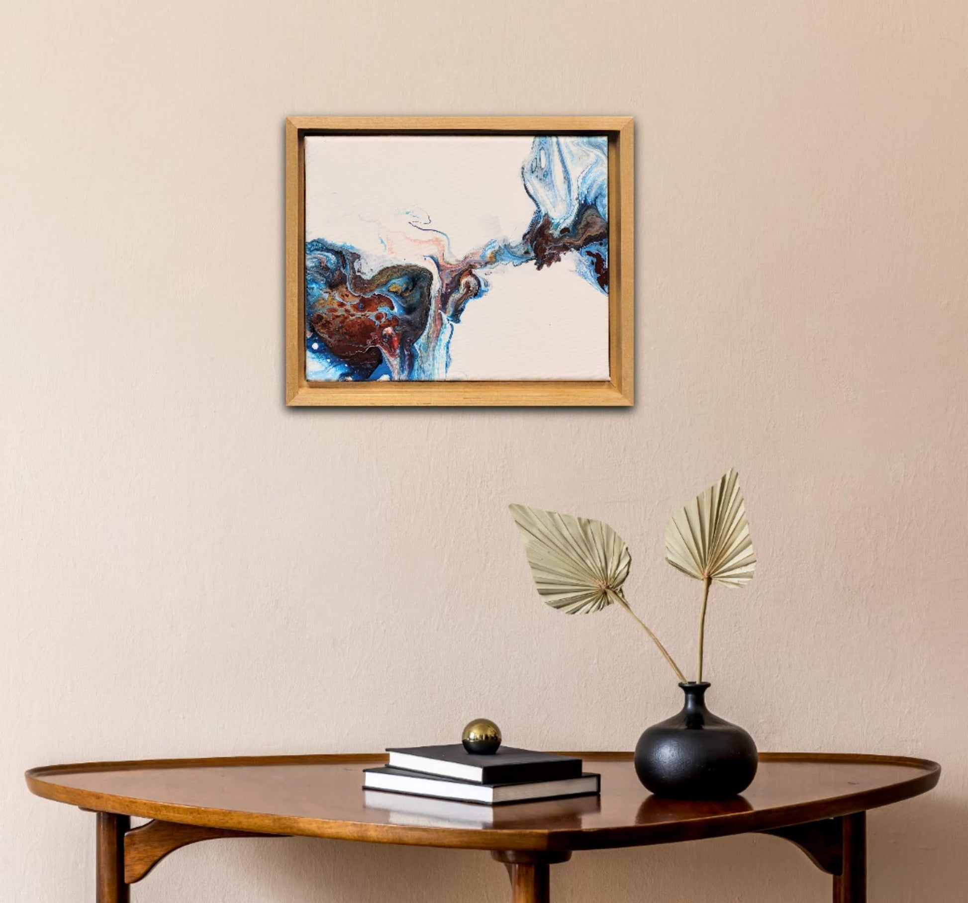 Measuring 10"x12" this painting comes with a modern minimalist natural wooden frame allowing it to sit on a mantle or shelves, in addition to hanging on the wall.