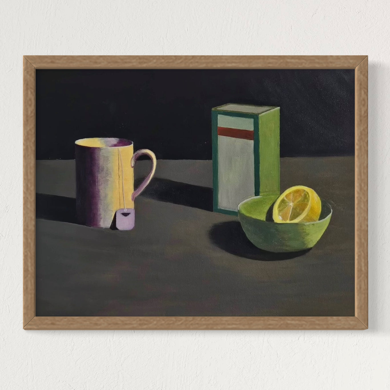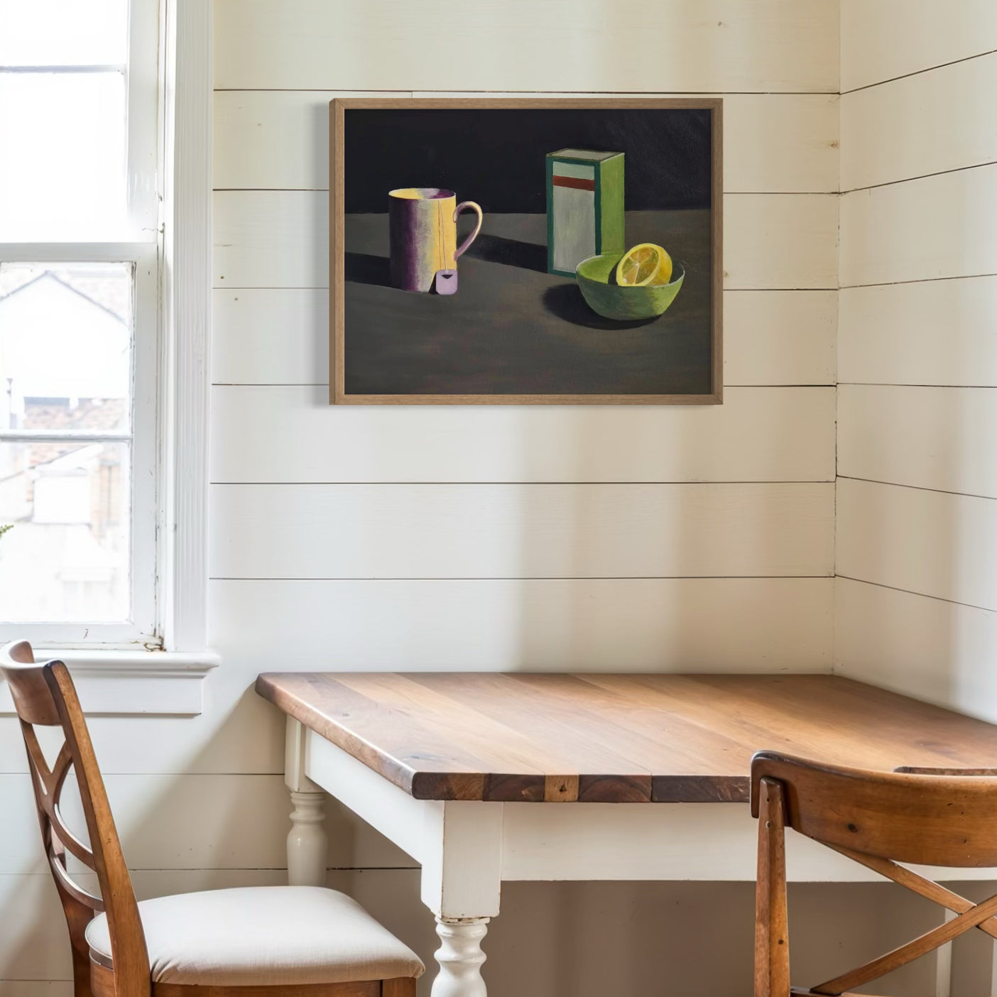 Acrylic painting on canvas board, framed in a minimalist natural frame.