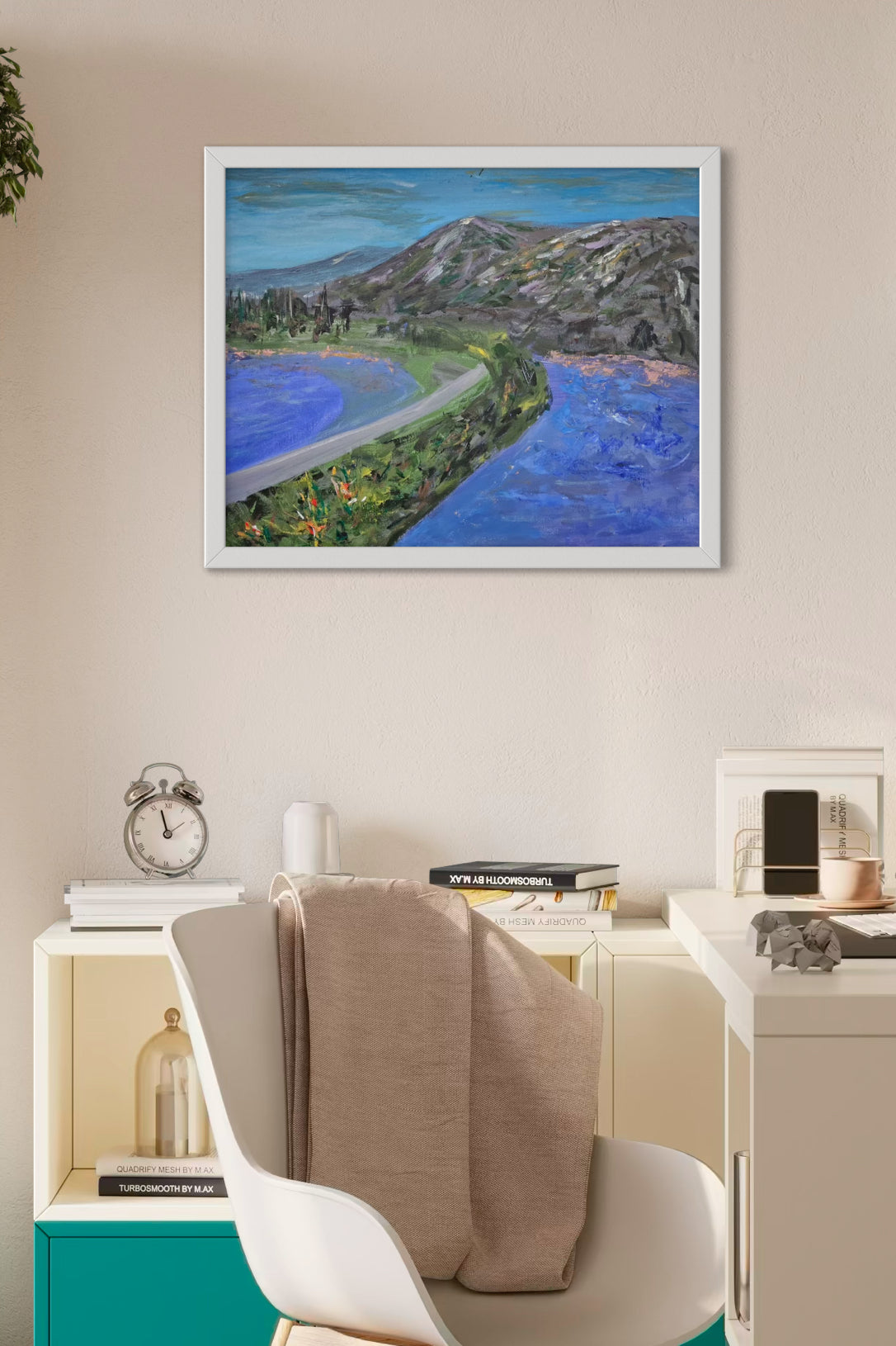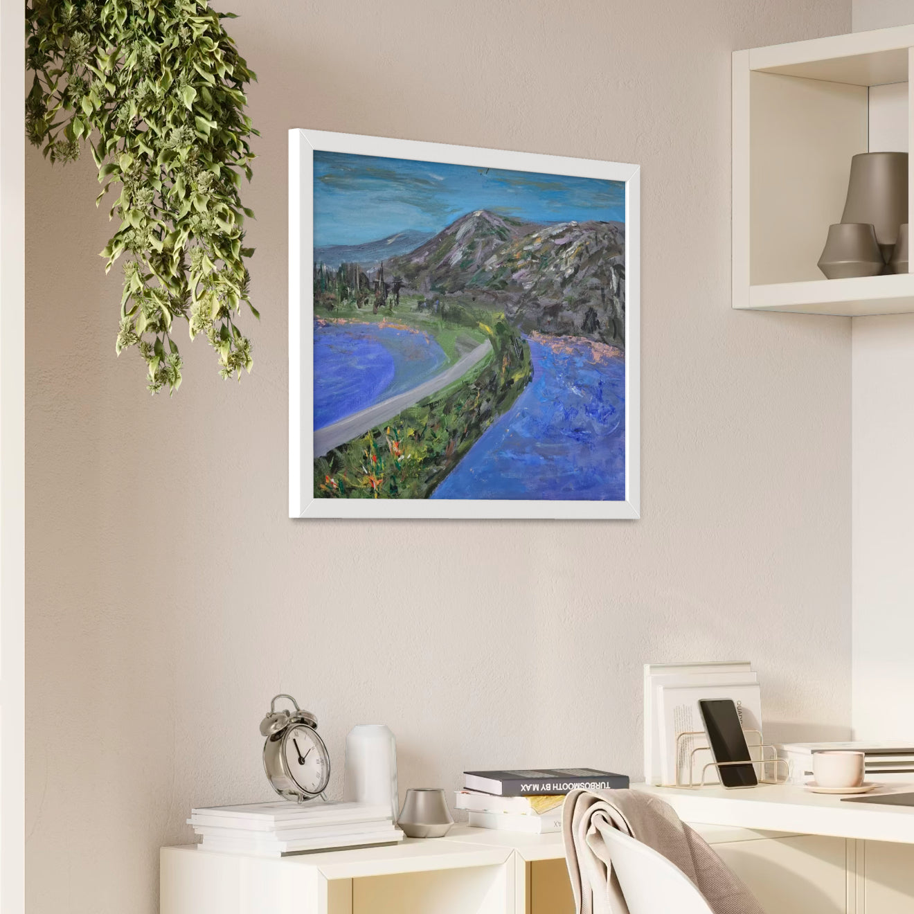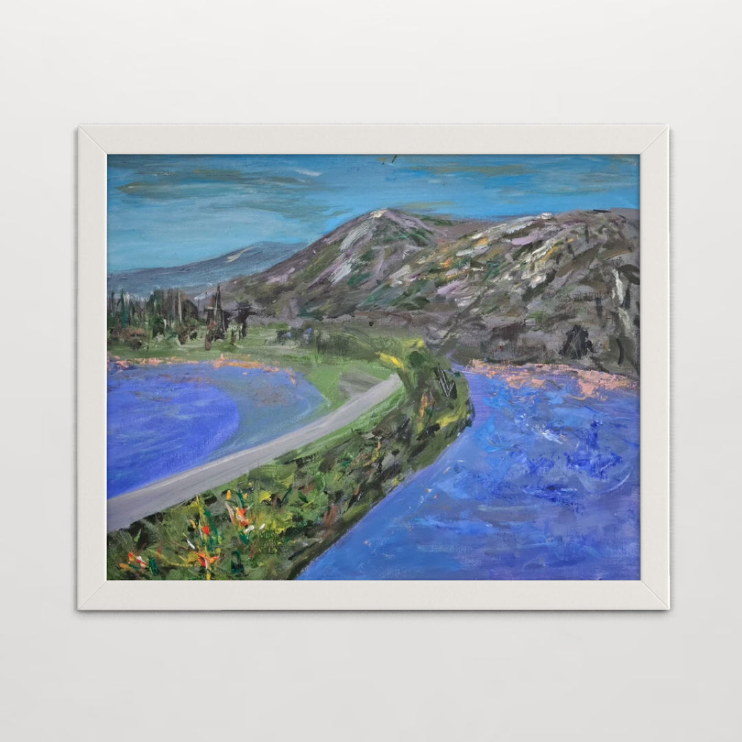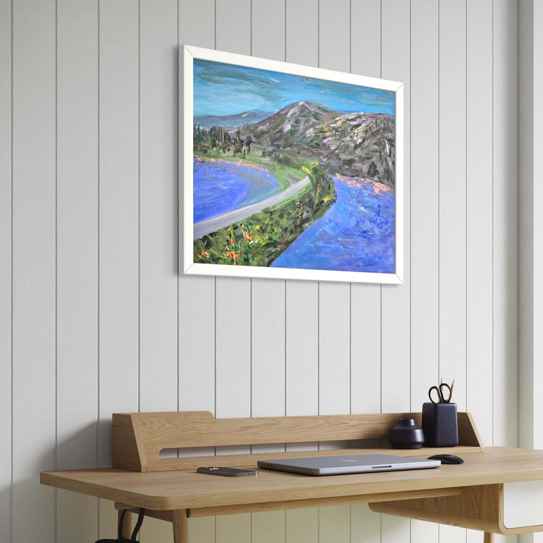 Acrylic painting on canvas board, framed in a minimalist white frame.