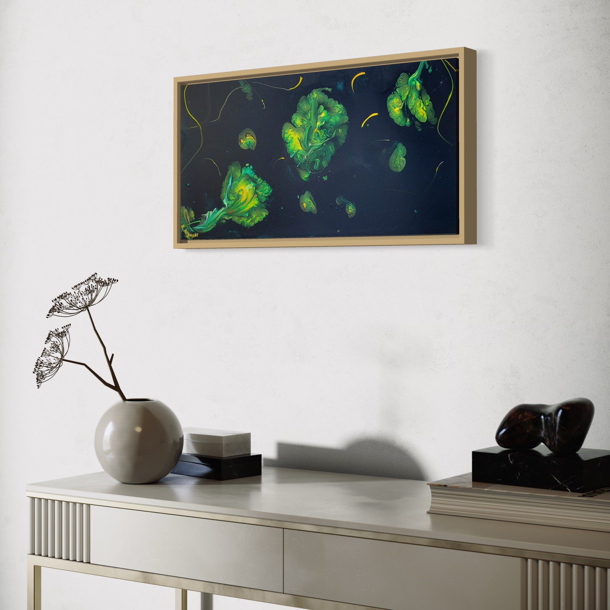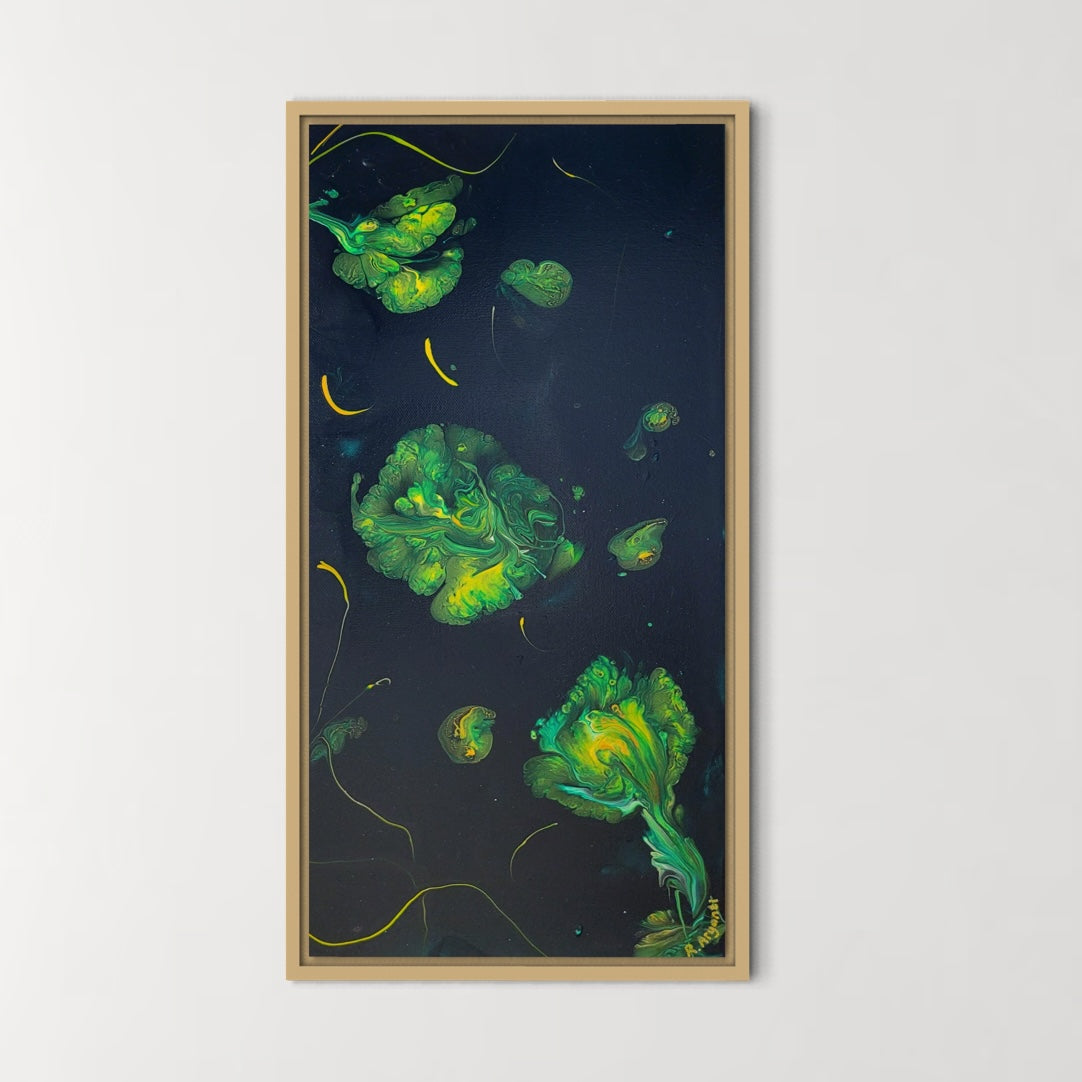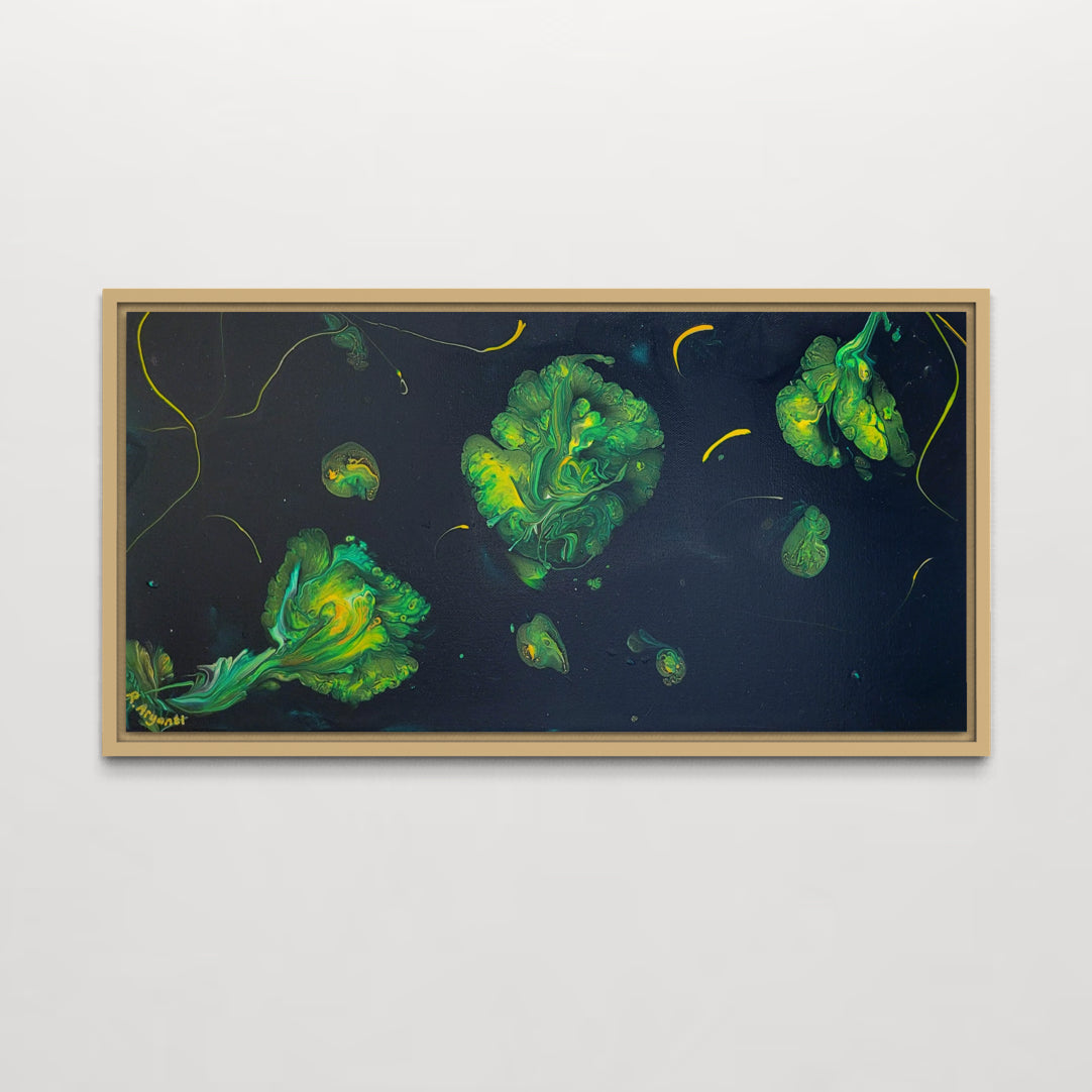 Measuring 12"x22" this painting comes with a modern minimalist natural wooden frame.