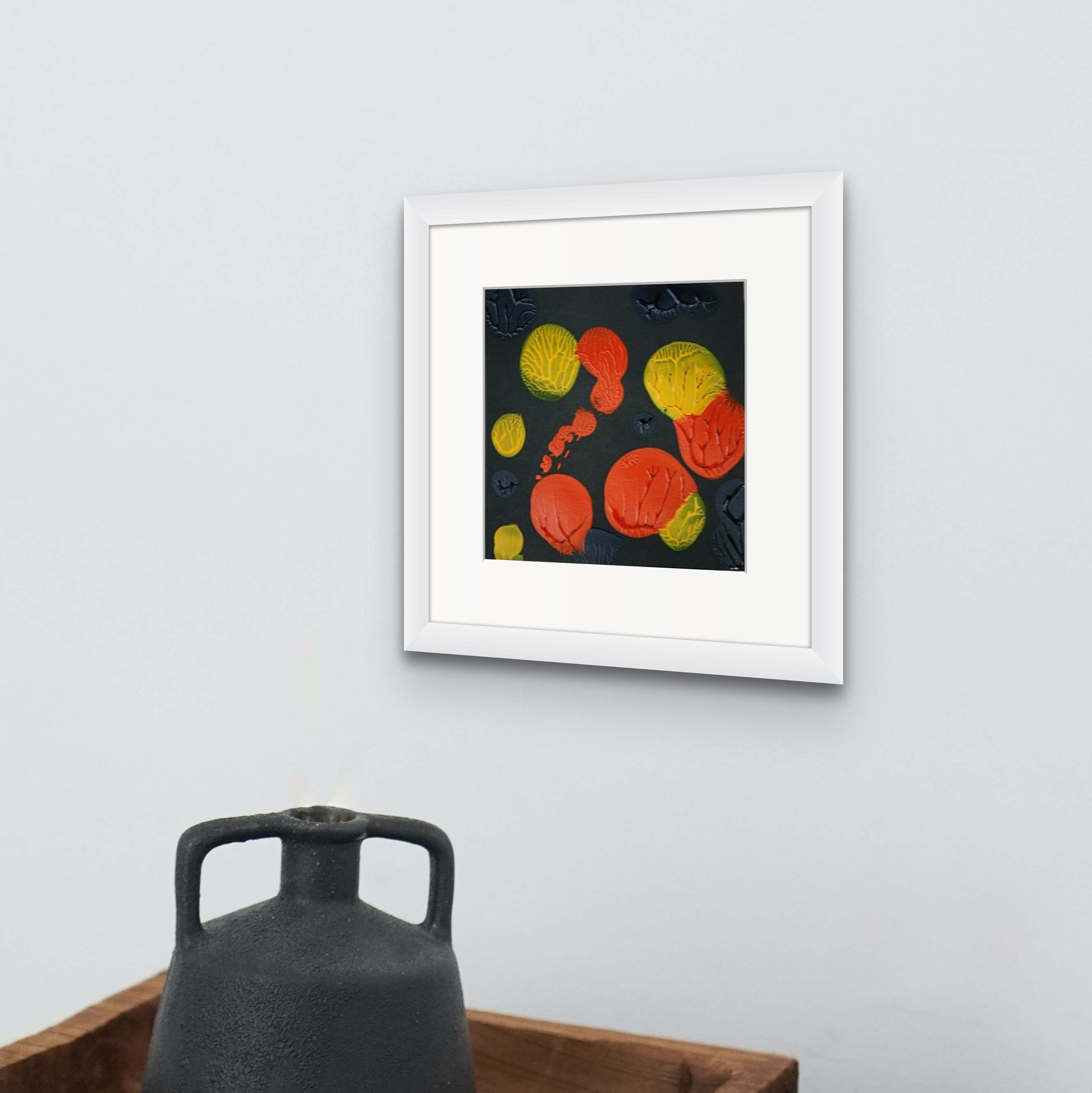 Measuring 9"x9", this artwork is made with acrylic on paper, came with a white box frame.