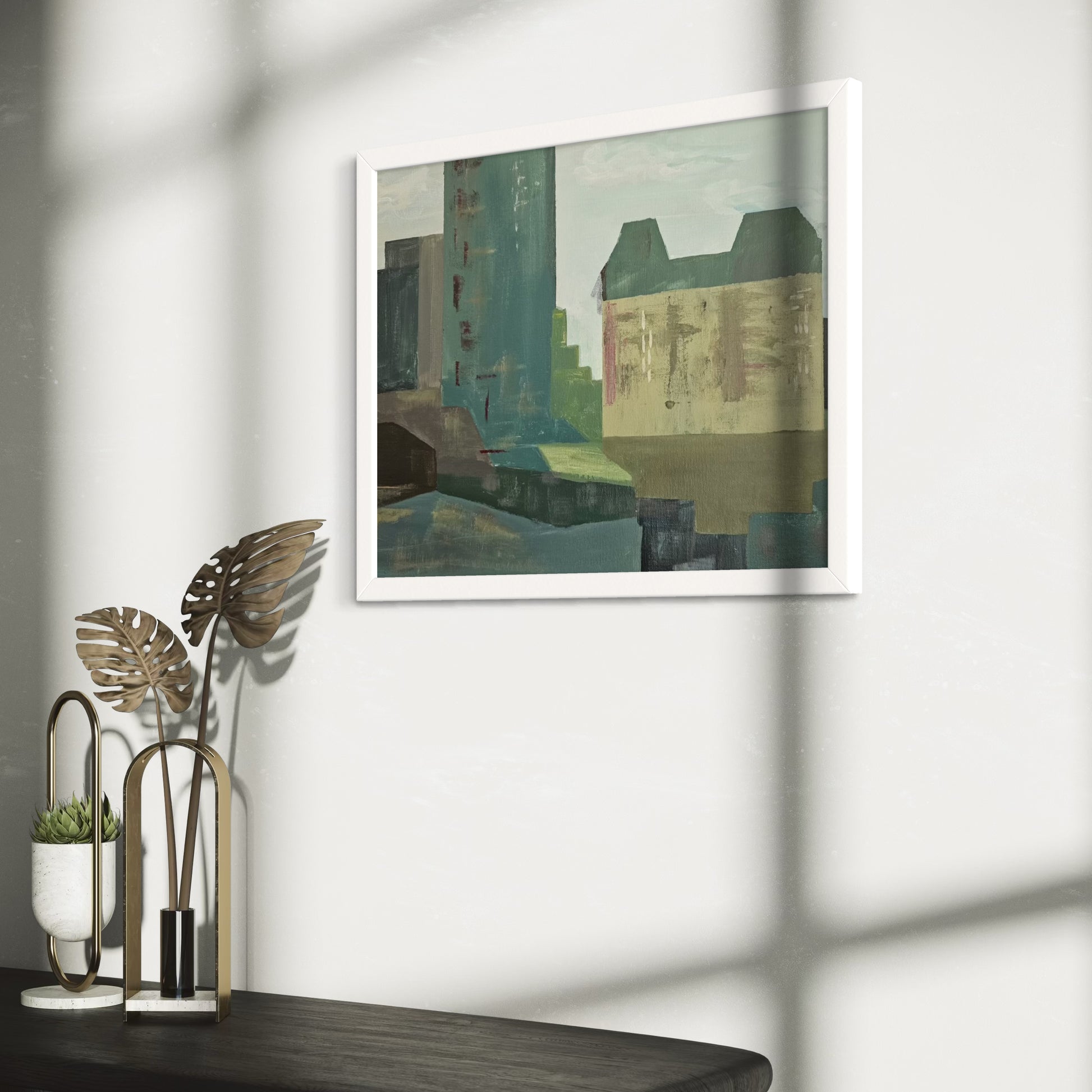 Acrylic painting on canvas board, framed in a minimalist white frame.
